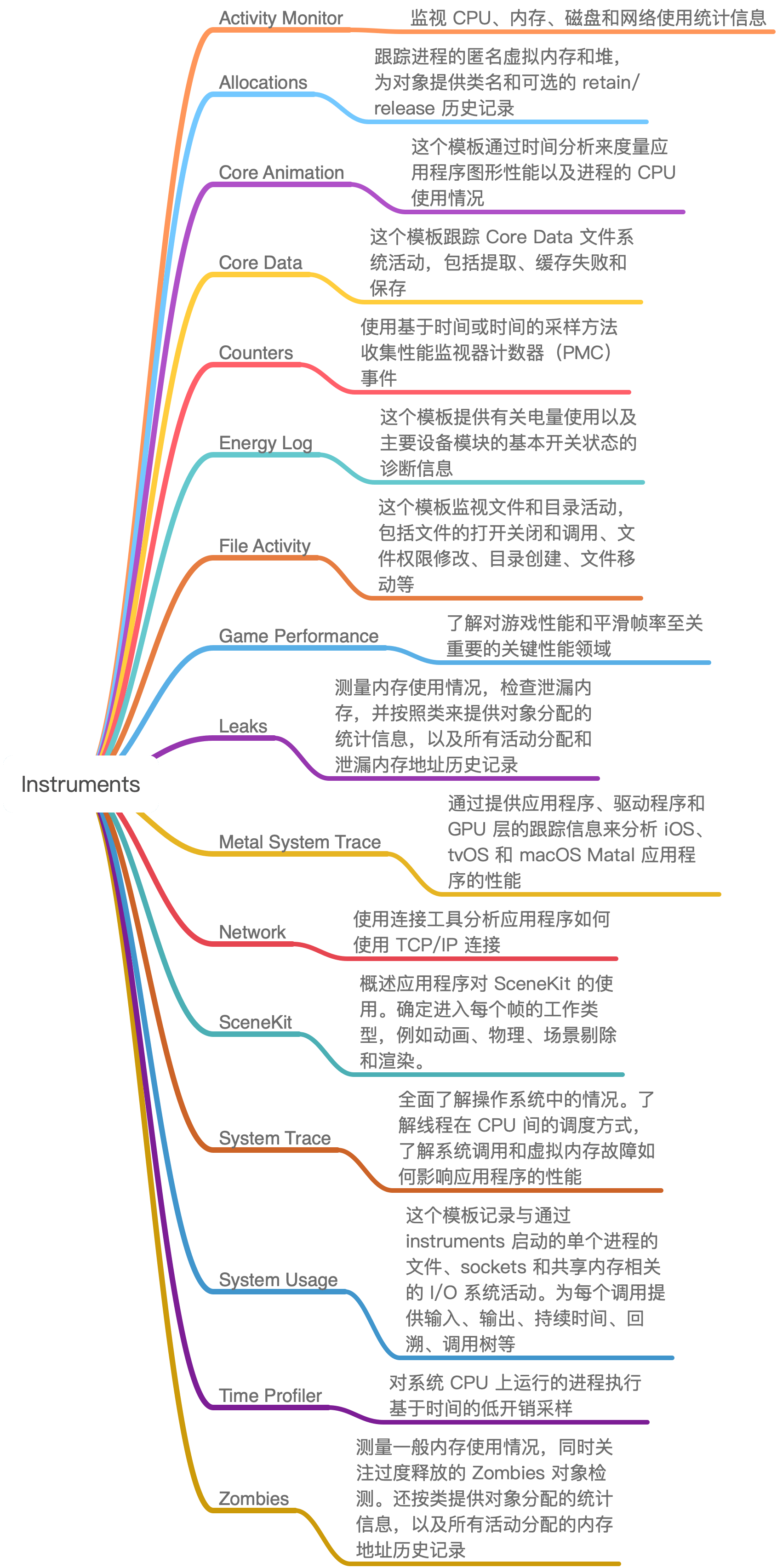 Instruments的功能非常强大,比如说Energy Log就是用来监控耗电量的,Leaks就是专门用来监控内存泄露问题的,Network就是用来专门检查网络情况的,Time Profiler就是通过时间采样来分析页面卡顿问题的。